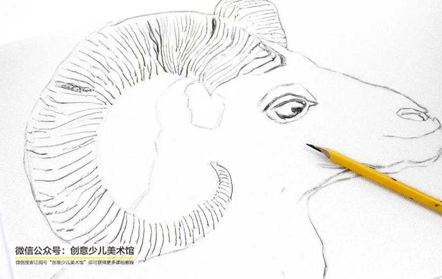 用铅笔在画面中刻画出大角羊的外形