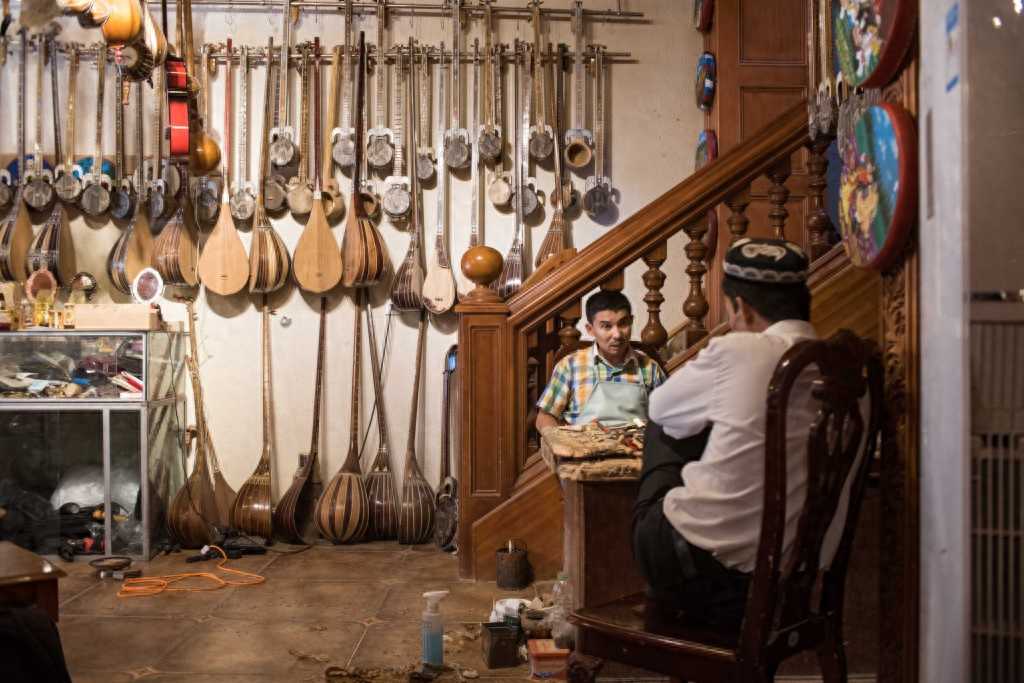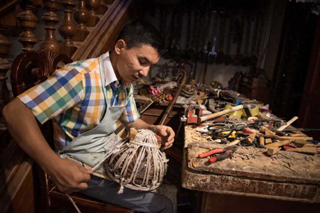 新华社照片,喀什(新疆),2016年7月6日以匠人精神传承民族乐器——维吾尔族乐器制造者阿布里米提·艾沙7月2日,阿布里米提·艾沙一边制作乐器,一边与一名顾客交谈。“会说话就会唱歌,会走路就会跳舞”,维吾尔族人天生能歌善舞,音乐和舞蹈早已深深融入到他们的血液之中。如果说音乐是维吾尔族人的灵魂,那么乐器就是维吾尔族人灵魂栖居的枝条。新疆喀什老城的艾沙汗阿吉维吾尔乐器店内,挂满了维吾尔族传统乐器,这是家族六代人200多年来传承民族乐器手工制造艺的见证。阿布里米提·艾沙是家族手艺的第六代传人。尽管已经小有名气,阿布里米提并不觉得自己在乐器制造上已经“出师”,他希望能与新疆和其他省份的大师切磋技艺。阿布里米提短期内计划在网上销售店内的民族乐器,“希望把维吾尔族人的乐器介绍给更多人”。新华社记者卜多门摄