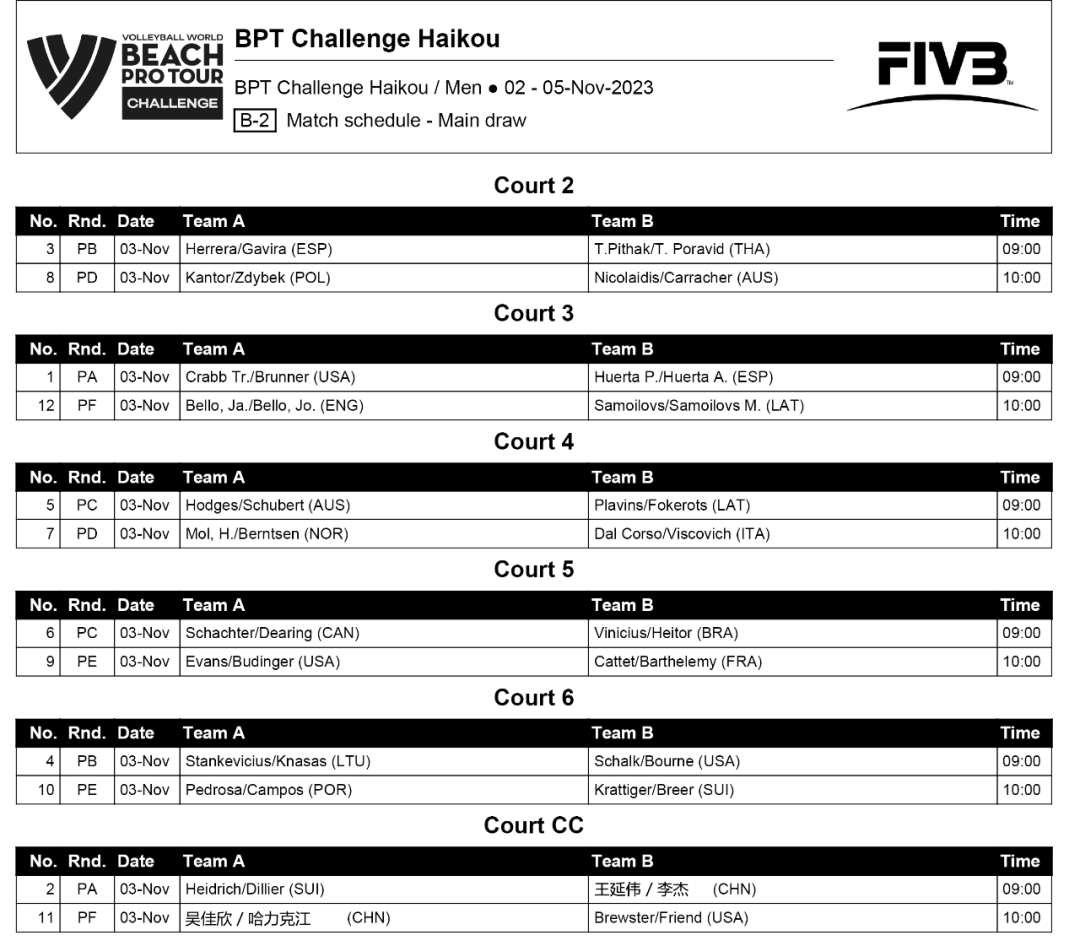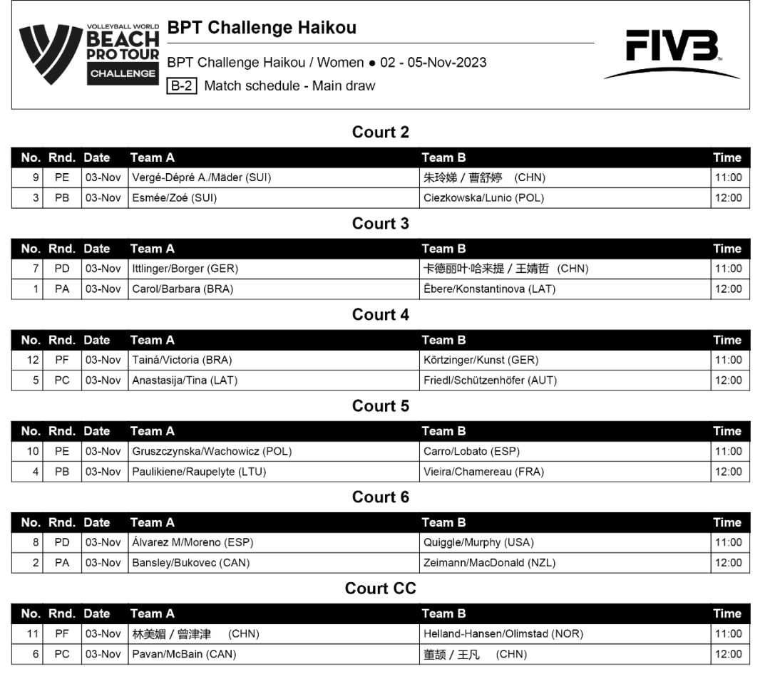 11月2日,由国际排球联合会(FIVB)主办,中国排球协会、海南省旅游和文化广电体育厅、海口市人民政府联合承办的2023世界沙滩排球职业巡回赛挑战赛正式开赛。中国国家队和来自日本、波兰、美国、意大利、奥地利、拉脱维亚、挪威等16个国家和地区的球队参加了首日的资格赛。