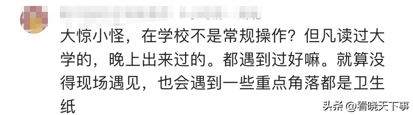 大惊小怪,在学校不是常规操作?但凡读过大学的,晚上出来过的。都遇到过好嘛。就算没得现场遇见,也会遇到一些重点角落都是卫生纸