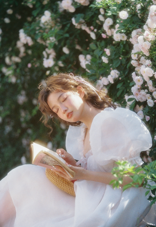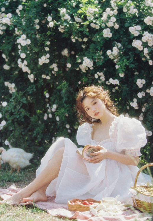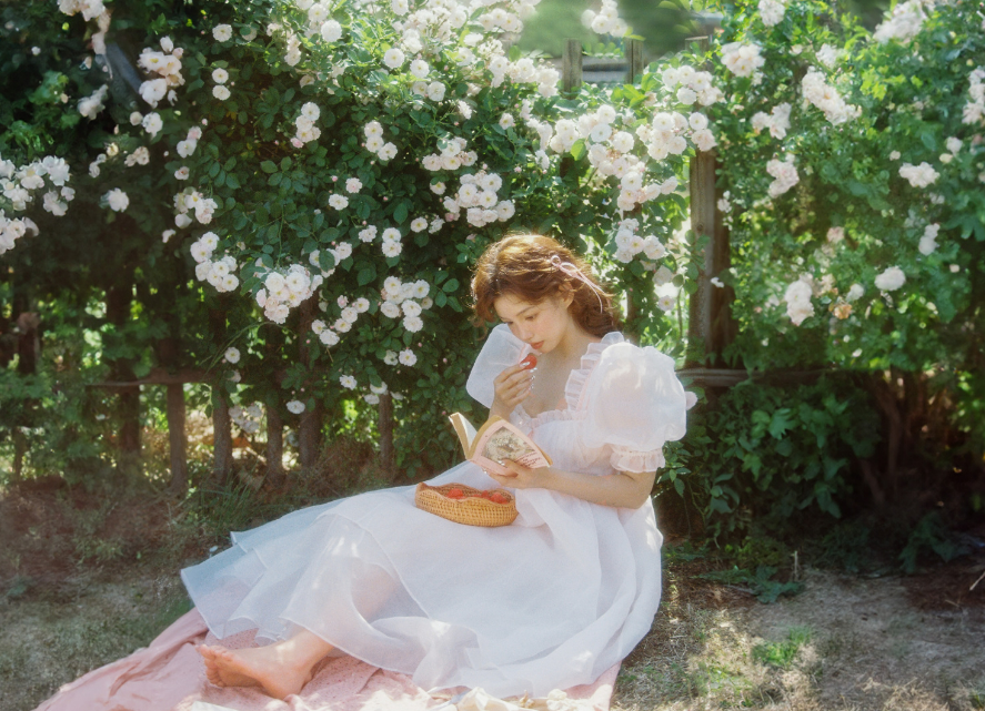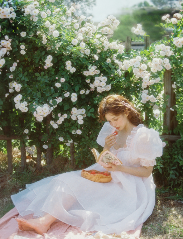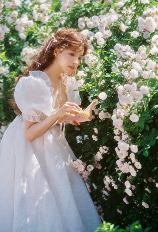 在玫瑰园里,有一位卷发女生,她穿着泡泡袖白纱公主裙,优雅而迷人。