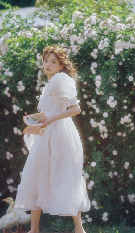 她的裙子是纯白色的,如同初雪般纯净无瑕。裙摆轻轻飘动,带着一种梦幻般的美感。泡泡袖的设计更是增添了几分甜美与可爱,让她看起来更加娇俏动人。