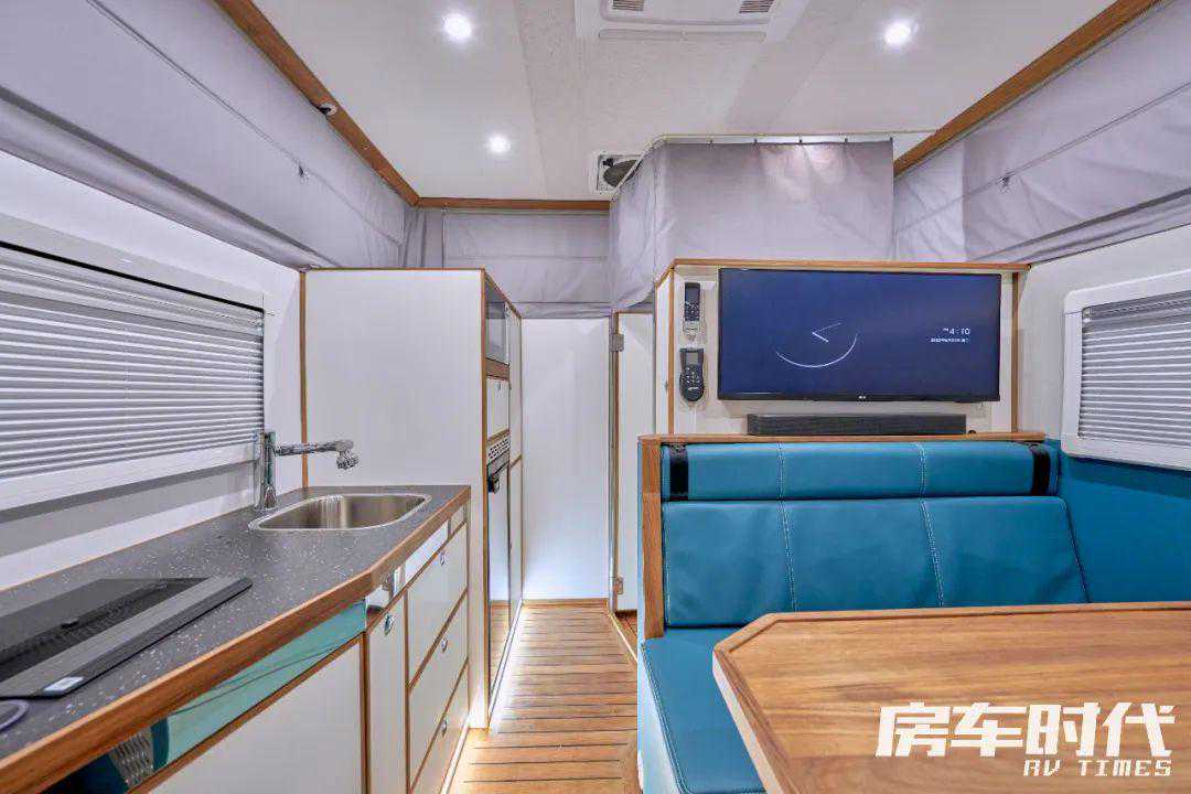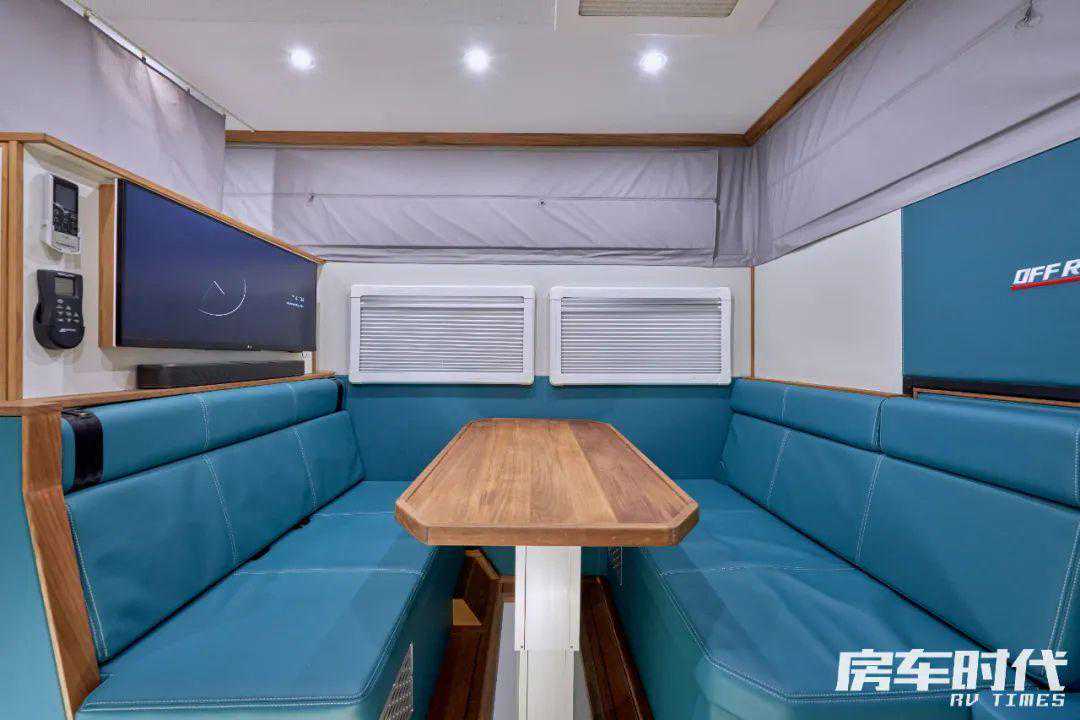 车厢中部是会客区,采用的是对向卡座搭配升降餐桌的布局。后方卡座上方是液晶电视和蓝牙音响,并且不同于大多数房车的四人对向卡座,这款房车采用的是六人对向卡座,这样即便有隔断,驻车时全车人也可以聚在一起。需要时卡座区还可以拼接成一张尺寸可观的大床。