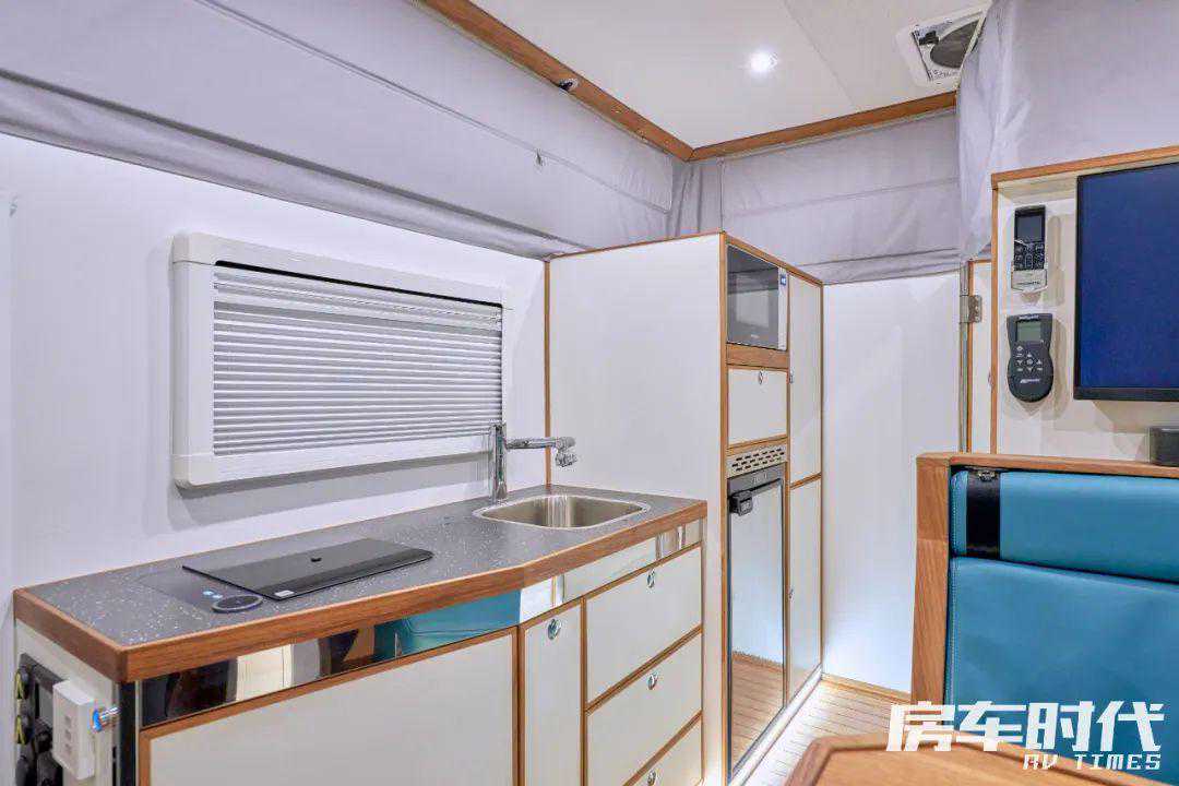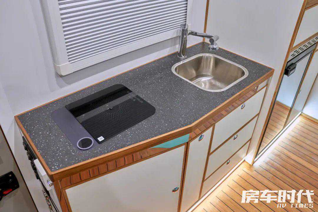 车厢右侧是厨房区,从车门一直延伸到车尾,尺寸颇大,配置齐全。车门处依然是熟悉的旅美速腾式设计,将厨房储物格结合在内。右侧是一体式橱柜,台面尺寸很大,集成了电磁炉、带锁碗柜、洗菜池和独立水龙头。