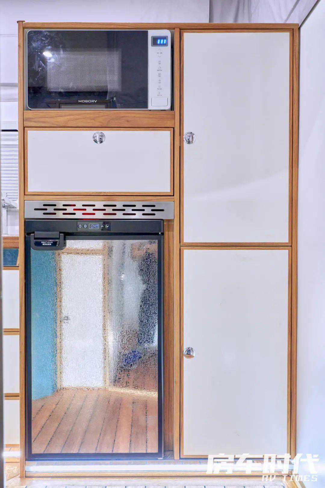 再往后是微波炉、车载冰箱和多个储物柜,造型别致,分布合理。