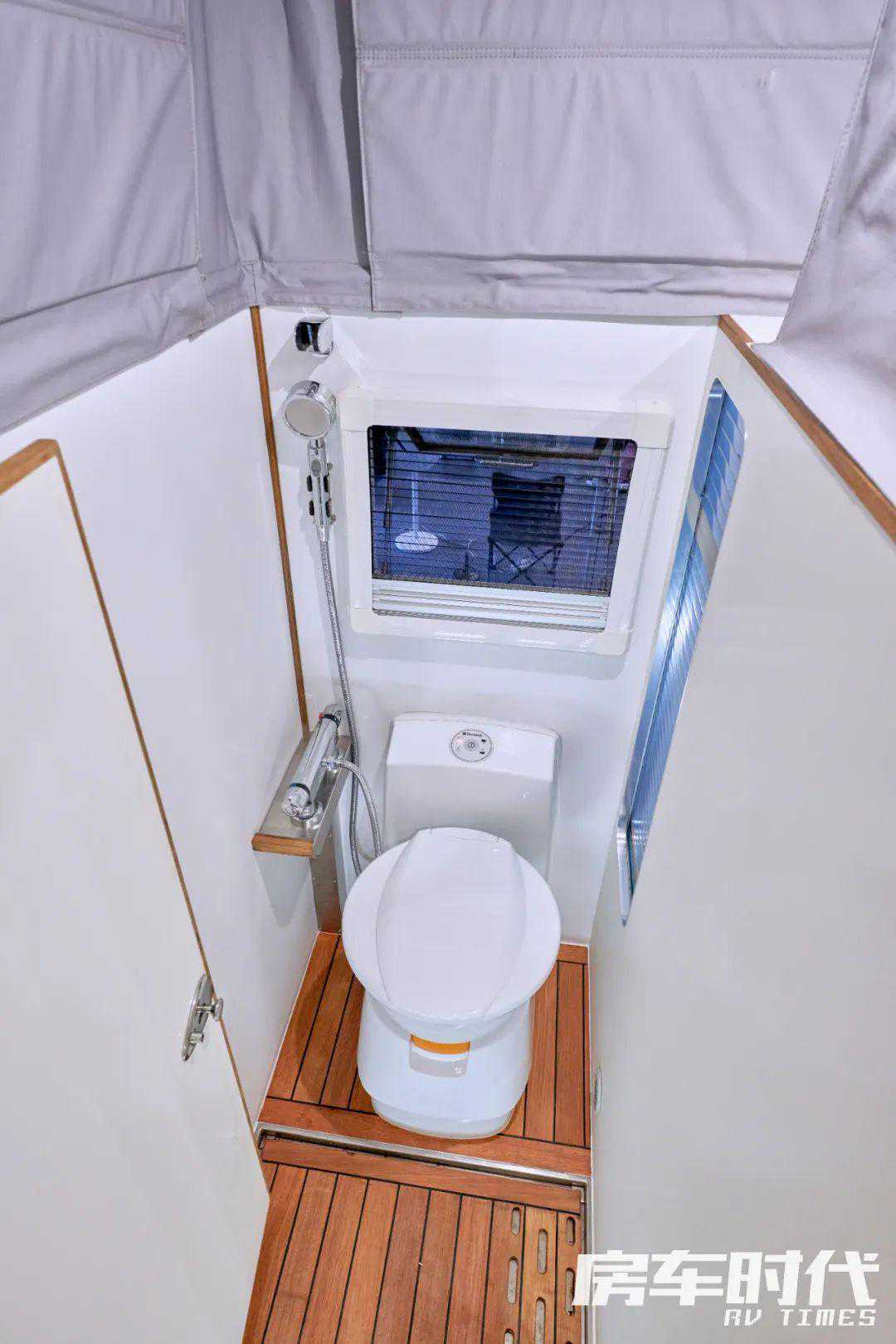 车尾另一侧是卫浴间,可以通过车门和防水布与生活区隔绝。内部配备有马桶、一体式洗手池和双淋浴系统等。