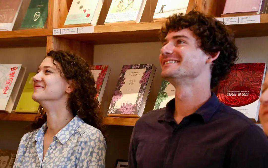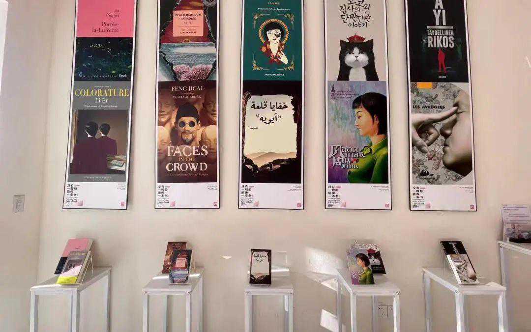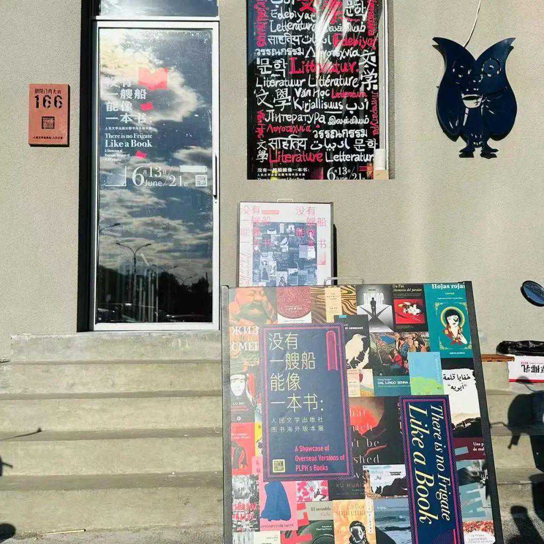 这场直播由人民文学出版社、中国翻译协会文学艺术翻译委员会共同主办。对谈正式开始之前,直播镜头随着两位嘉宾的脚步,带领观众们云逛了升级后的咖啡店。首先是去年做直播的地方——也就是我们的18平米旧址,如今成为新店隔壁的小厅,正值北京国际书展,人文社对外合作部在这里办了一场特别展览“没有一本书能像一艘船”,陈列出人文社出版图书的海外版本,总计有25种不同语言的图书译本,共展出258种图书。