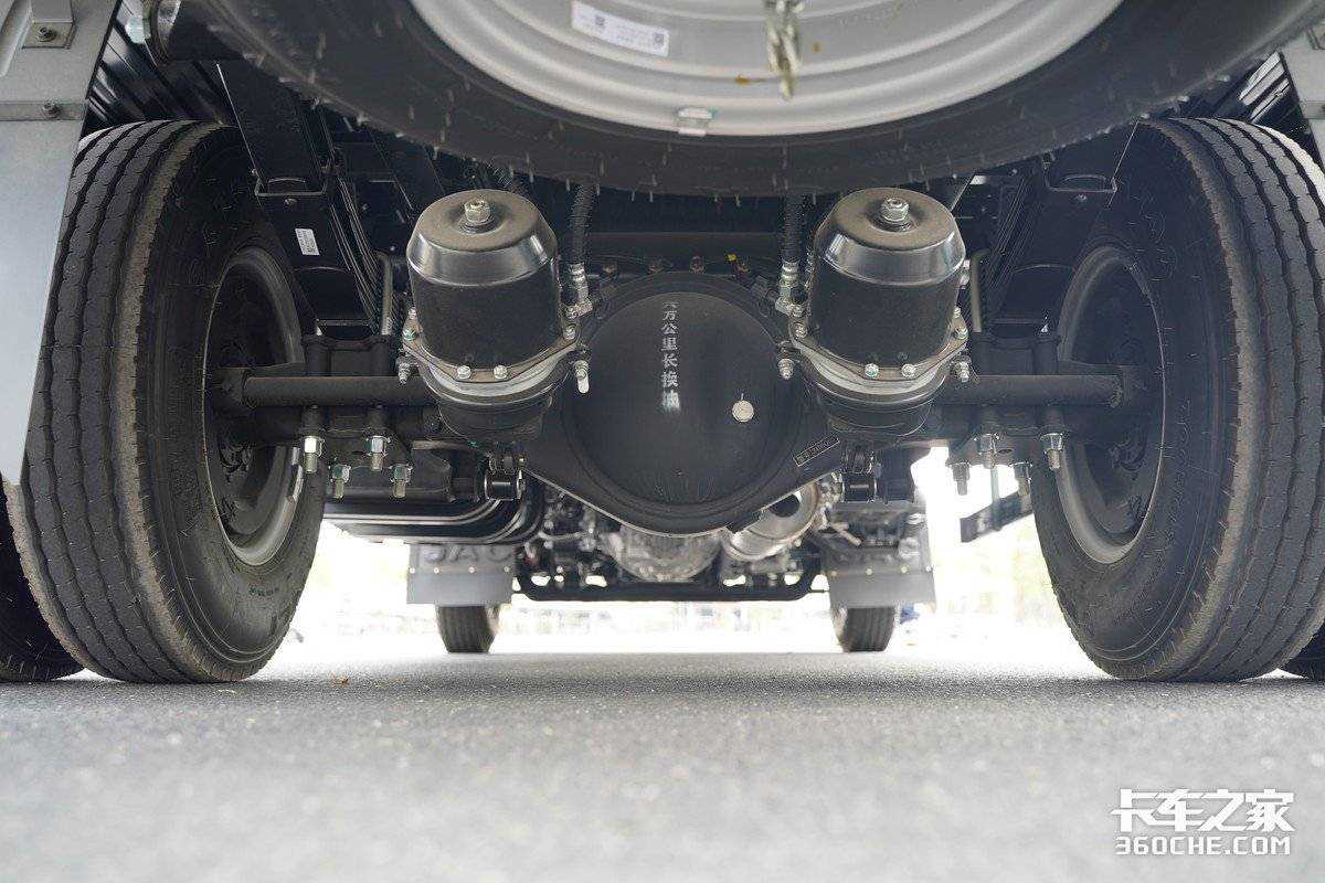 底盘方面则是前桥采用了两吨级设计,后桥为美桥四吨级设计,并且前后桥的轮距都进行了加宽,同时还可选装横向稳定杆,提升车辆在转向时的操控能力。同时实拍车型的后桥速比为4.875,根据载重量和工况的不同,也可以匹配4.33的速比。
