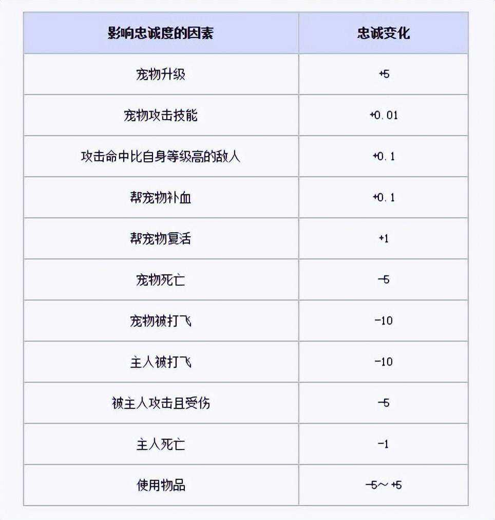 做为宠物的主人,最关心的还是自己的宠物是否听话。相信各位玩家都比较清楚“调教”等级的高低和玩家“魅力”对宠物忠诚度起到关键作用,二者中“调教”等级的高低决定了宠物忠诚度的上限,当“调教”LV1时,可以保证1~10级的宠物忠诚度上限为100;LV2时,可以保证11~20的宠物忠诚度上限为100……依此类推,每个职业的调教等级不一,那么超过了调教所保证的范围后,宠物每升一级,忠诚度下降4点。