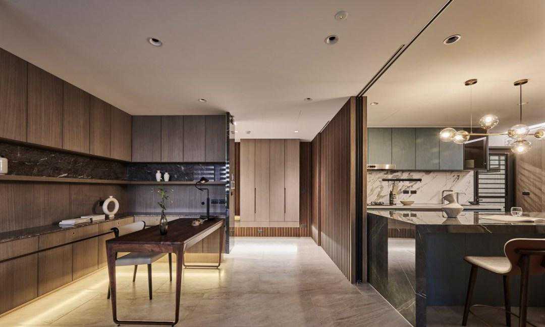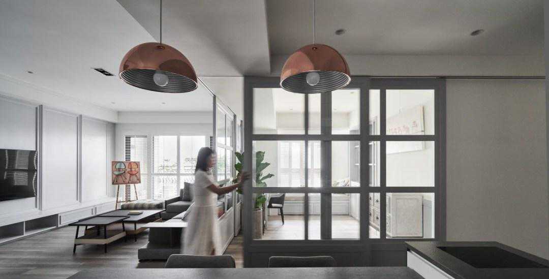 开放又独立!灵活隔间拉门,切出独立书房、餐厨!利用完全敞开的空间,赋予了开阔的公领域视野,但因应烹饪时的油烟问题,以及专注的阅读使用,也需要适度的隐私性。设计师以两道弹性的长虹玻璃拉门,使空间可以自由弹性分割和切换,也能维持空间的透亮光感。