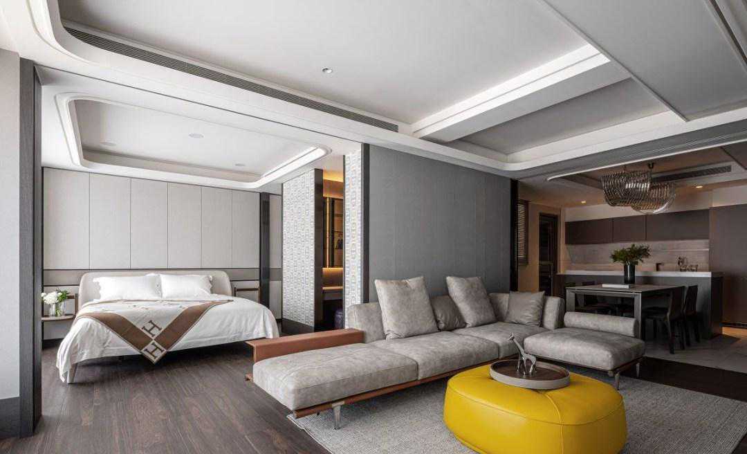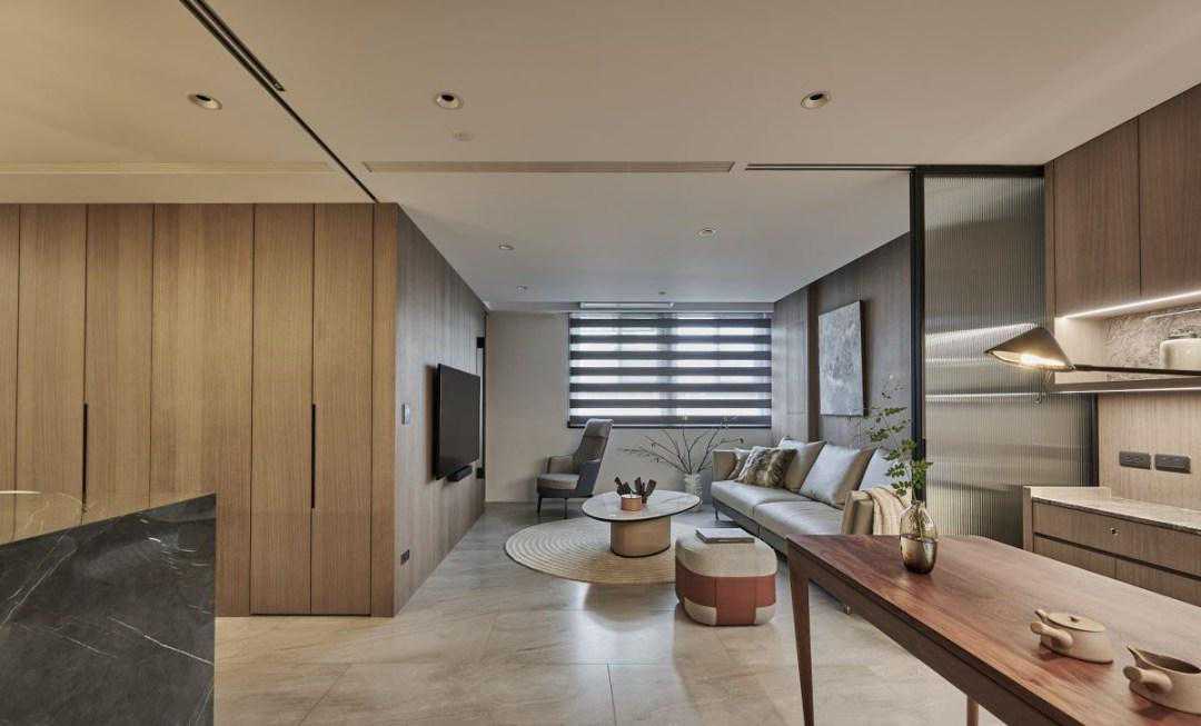 自由决定房间数量,四扇活动隔间的超展开!沙发后方定义为主卧空间,设计师特别将门宽拉至3米,当拉门开启时与客厅完全开放连结;而电视墙左右两侧也利用拉门设计,设定通往书房与客房的路径,并在两房之间规划隐藏玻璃拉门,因应各种生活情境的变化性。