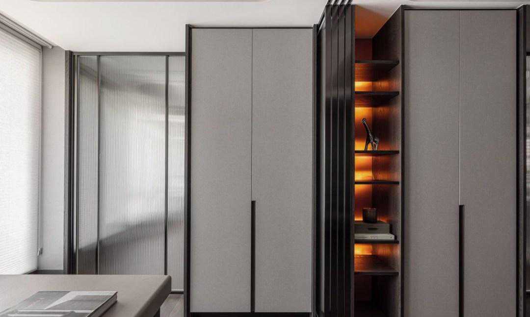 两扇玻璃拉门切换格局,瞬间增加一房!许多屋主都会期待拥有宽敞的客厅,但偶尔也会需要独立的办公区,以及临时性的客房,设计师利用两扇玻璃拉门的调节规划,为格局进行弹性切换,透过通透的介质,使室内采光更加透亮,可变动的格局也能符合实际需求
