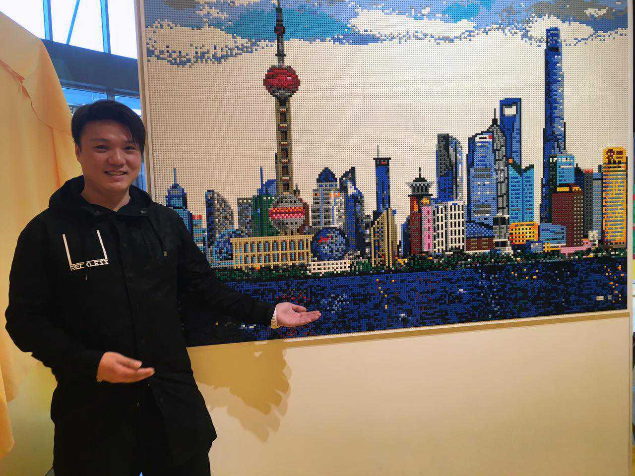 洪子健在浦东百联世纪购物中心开幕上搭建的陆家嘴乐高马赛克画。