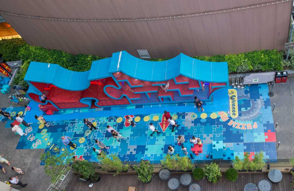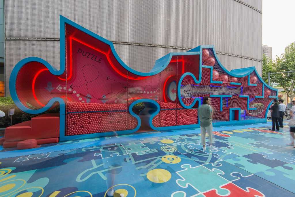 100Architects:PuzzleMaze是一种公共空间设计,旨在促进互动、吸引顾客,增强户外零售街道中私有公共空间的体验。