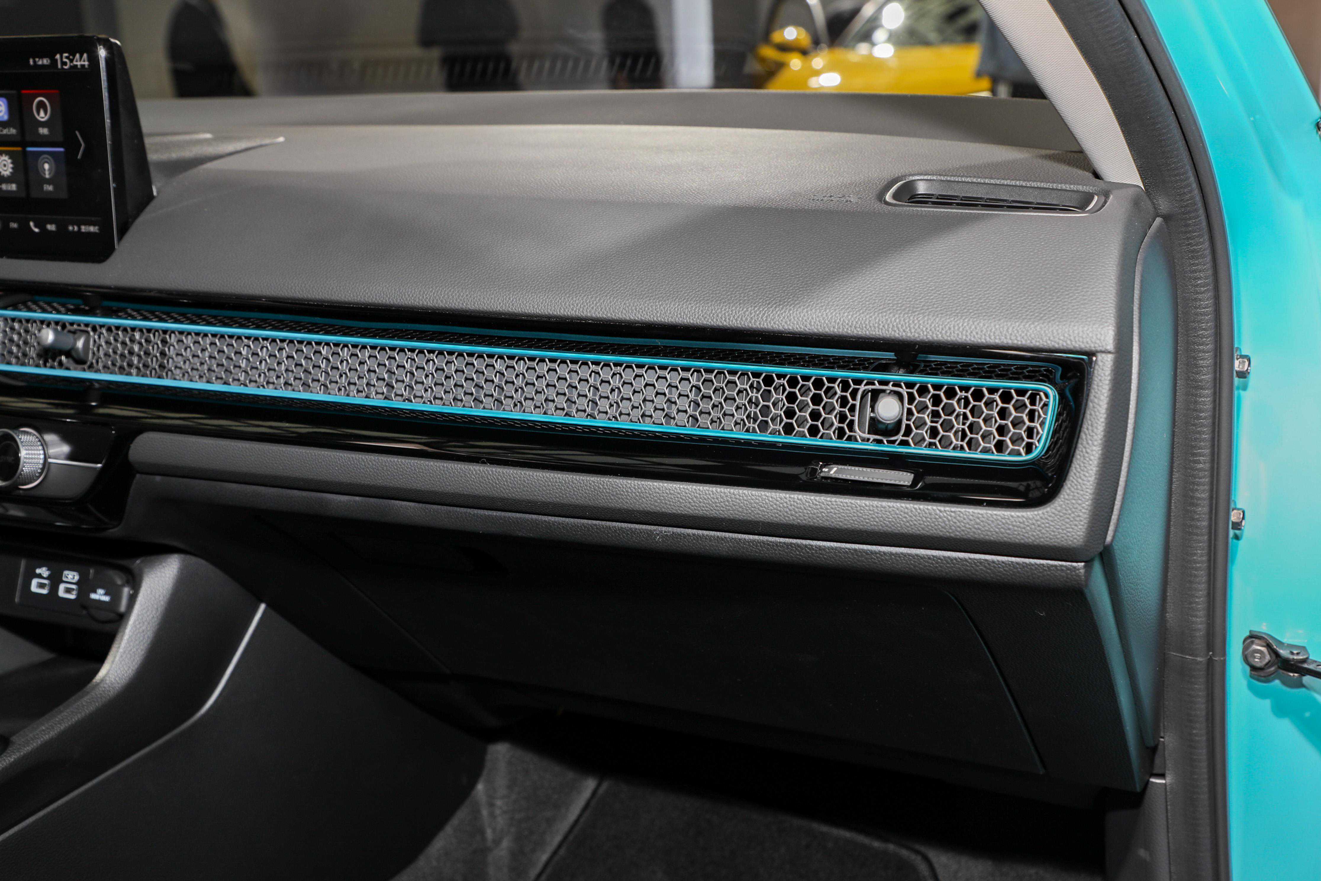 内饰方面,型格中控台设计风格和功能布局与思域类似,并配备有三辐式方向盘和大尺寸显示屏,其中实拍图中的翡绚蓝车型还在内饰出现与车身同色的细节配色。根据目前官方公布信息,型格配置部分可提供便携式卡片钥匙和12扬声器BOSE音响。