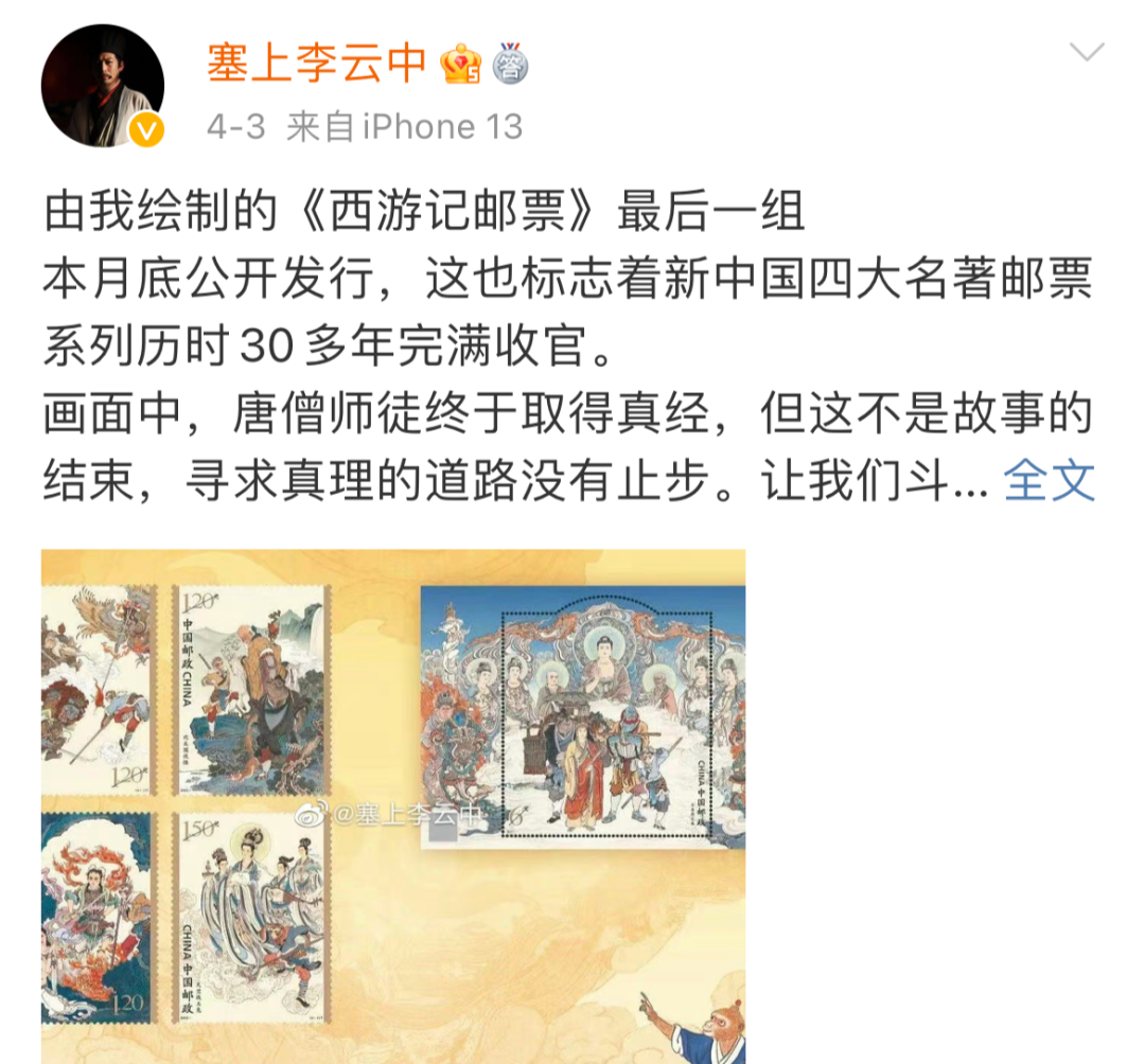 西游记(五)珍邮的创作人——李云中老师也在微博公布了西游记(五)邮票图片,揭开了这组收官之作的神秘面纱。