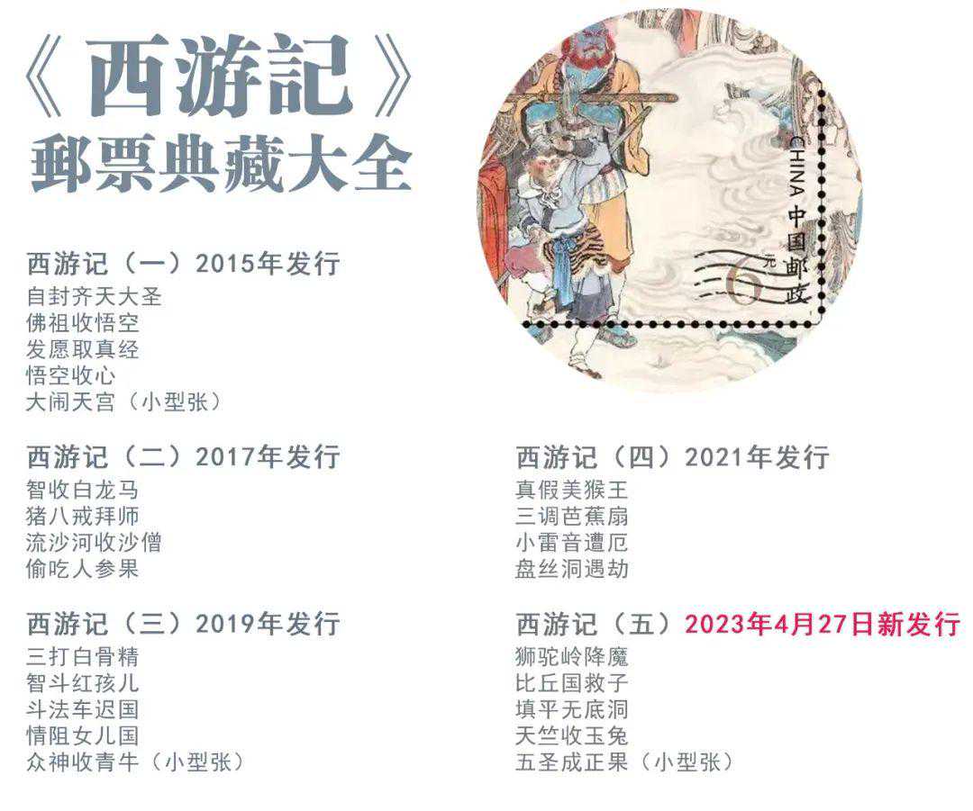 收官品种《西游记(五)》邮票、小型张,原定于2023年4月23日(世界读书日)发行。为配合2023年第19届全国邮展,推迟到4月27日全国邮展开幕日发行,这是全国邮展一大亮点,可见这组邮票的分量举足轻重。