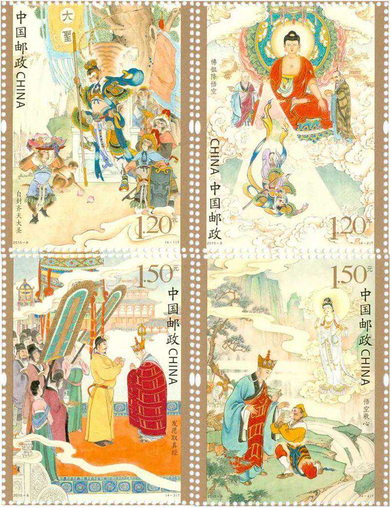 邮票图案分别为:自封齐天大圣、佛祖收悟空、发愿取真经、悟空收心。