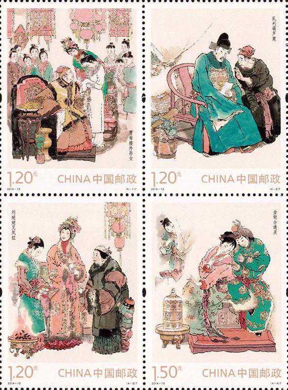 邮票内容分别为凤姐弄权、龄官画蔷、晴雯撕扇、宝玉受笞。