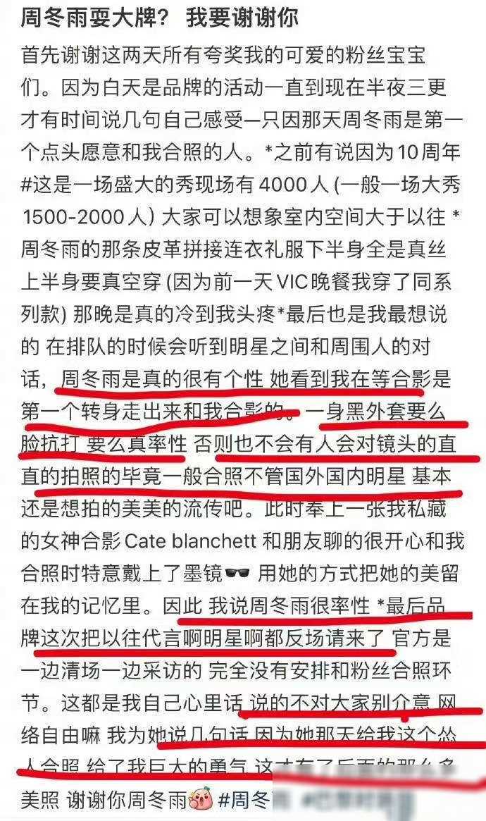 值得注意的是,一些参与活动的网友纷纷发声,表示周冬雨在现场表现得很和蔼,与之前的指控形成鲜明对比。有人晒出与周冬雨的合照,并表示周冬雨是当天第一个点头愿意合影的明星,更感激她给了自己勇气。这样的声音是否能够颠覆之前的指控,我们还需要更全面的了解。