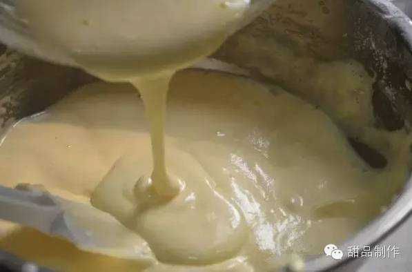 取一小部份蛋糊放入乳化好的液体中拌匀。