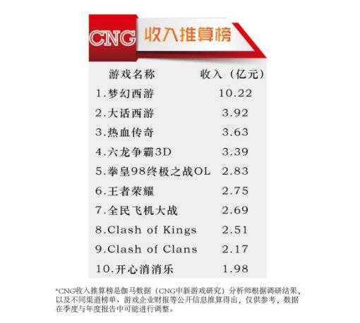 根据推算,当年11月,《梦幻西游》手游的月流水已经超过10亿,甩开收入榜第二名两个身位不止。而此时的第二、三名也均是改自端游的IP游戏,同样来自网易的《大话西游》,和盛大的《热血传奇》。(《王者荣耀》也在这个月刚刚诞生)