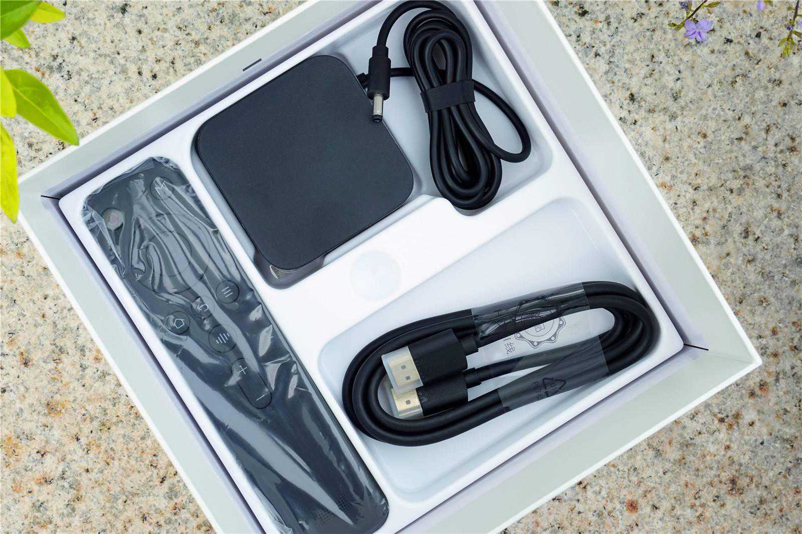 随机配件有:天猫精灵魔盒主机、说明书、红外遥控器、电池、电源适配器、HDMI线。