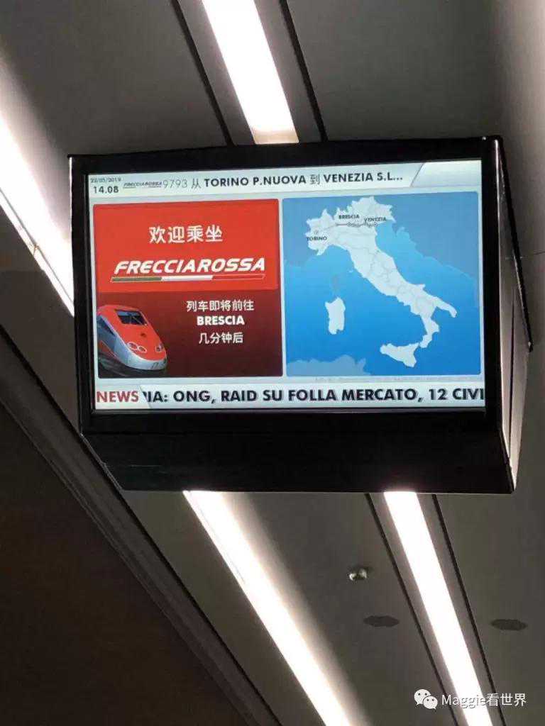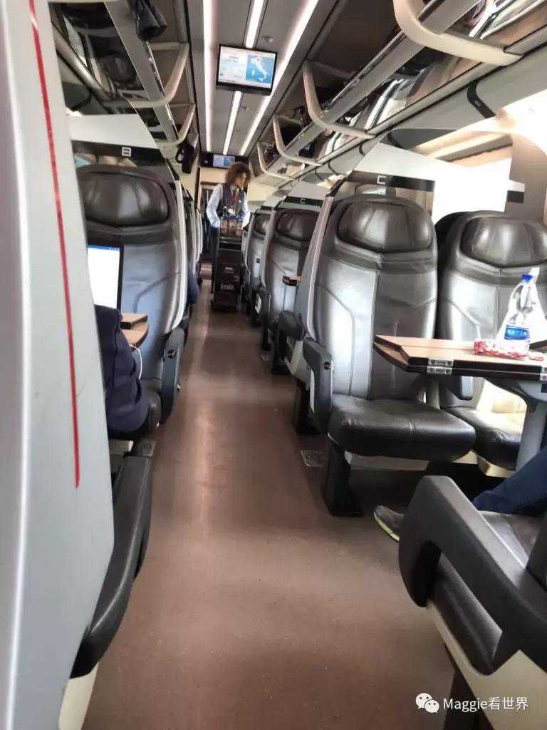 这还是我第一次坐意大利的火车,总体感觉还是比较宽敞舒适,只是车速并不快,285公里要走两个多小时。但是有免费的小吃和一小杯饮料或酒,有点儿像我们飞机上的供应。惊喜是中文的报站和说明,印证着这条线路是中国游客的热门旅游打卡地。