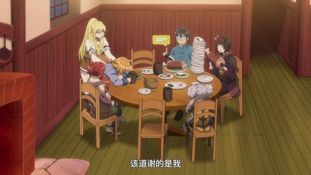 来到了新的城镇,男主和同行者要分别了,毕竟一方是冒险者,一方是商人。分完魔物的战利品素材后,一行人约定开个宴会。开宴会就是吃吃喝喝,男主见到了漫画肉,内心大受感动。在吵吵闹闹中,宴会结束。