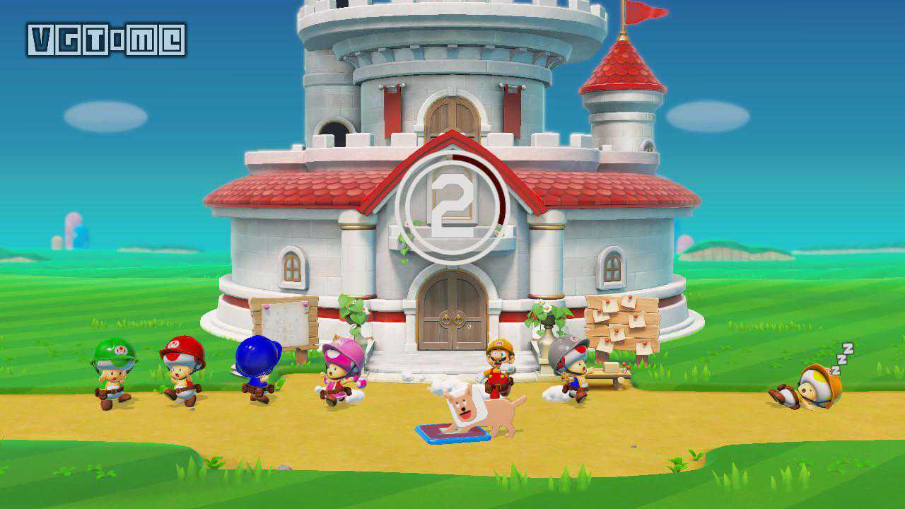 主打线上模式的游戏,往往都会用单机模式充当教程,《马造2》也是如此。游戏的“故事”设置很简单:一条傻狗踩到了重置火箭,让马力欧和奇诺比珂们建造的城堡毁于一旦。玩家需要做的,就是控制马力欧,一步步重建城堡。