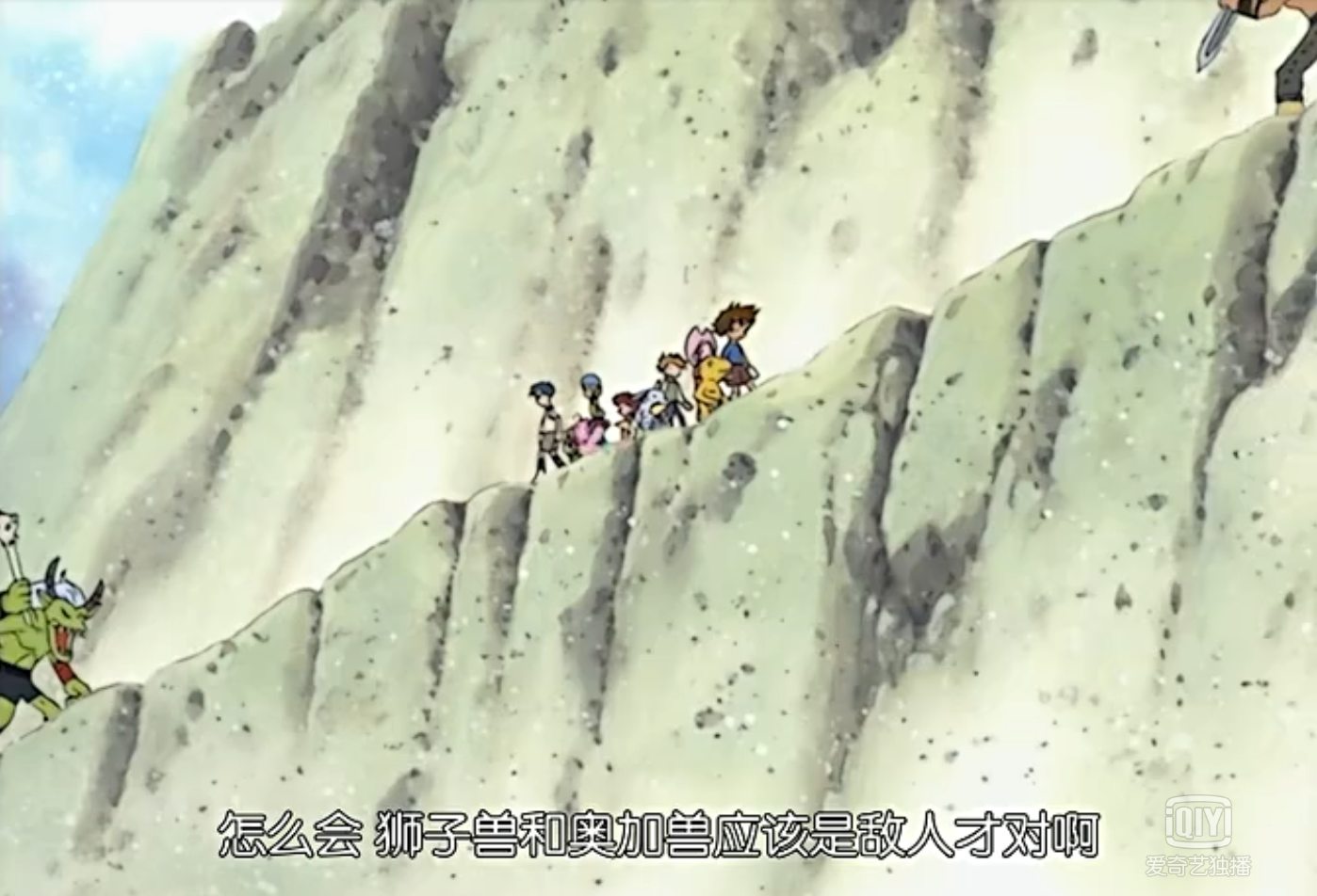 另一头,终于登上了路易斯岛的制高点的被挑选中的7个孩子绝望地发现,此时此刻,他们的的确确被困在了一座孤岛之上,几乎没有回到原先宿营地的任何希望。得知了这一结果的他们,虽然内心非常沮丧,但还是开始做起了下一步的打算,太一甚至还画了岛图,虽然画的实在是不堪入目,但好歹说明了这帮孩子们习惯于预先准备的那种意识。就在他们准备下山的时刻,遭遇了狮子兽和奥加兽围攻,危机之下,数码宝贝纷纷进化变身,击退了狮子兽和奥加兽。