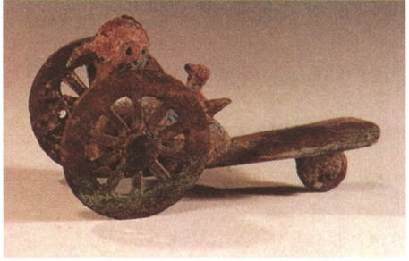 竹马游戏之所以在古代持久流行,除了道具简单外,还跟古代贵族车马制度有关。儿童模仿骑大马的同时,还会以车形玩具模仿乘车。比如,古书中经常与竹马相提并论的,就是“鸠车”。如晋人杜夷曾说:“儿年五岁,有鸠车之乐;七岁,有竹马之欢。”2001年,在河南巩义新华小区东汉墓中,出土一件“铜鸟车”。其主体是一只长尾鸟,足被两轮取代,鸟小喙。这只大鸟的胸前攀附了一只嗷嗷待哺的小鸟,背后亦卧有另一只小雏鸟,十分动人可爱。这种汉代铜鸟车又被考古学家称为“子母鸠车”。它们被放入墓葬中,可能就是墓主人生前珍爱的“玩具车”。