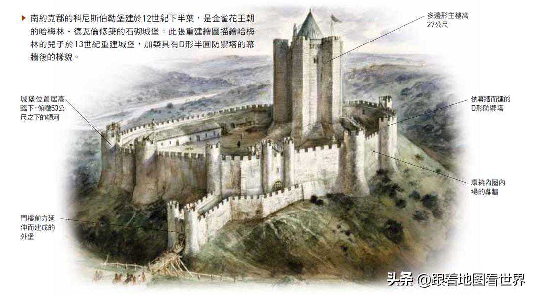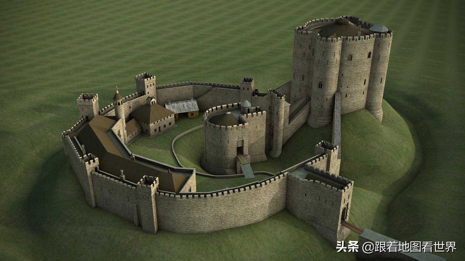 12世纪英格兰的一座城堡的复原图,它采用了石质材料,只有强大的攻城武器才能将它攻陷。