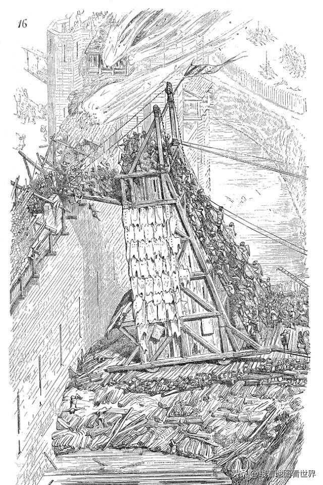 护城河被柴捆填平后,满载登城士兵的攻城塔靠近了城墙,这时墙上守军居高临下的优势已不复存在。