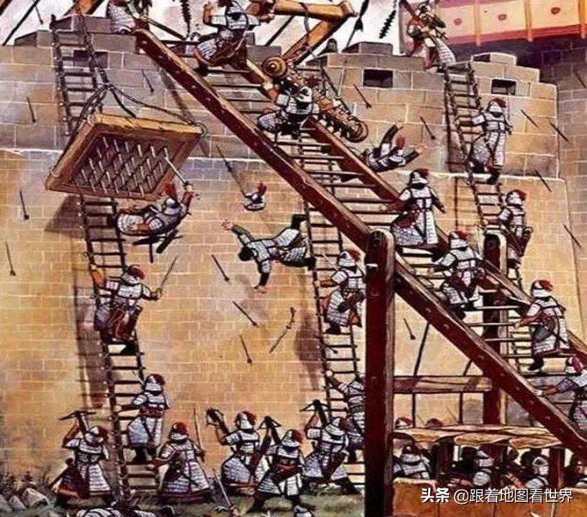 攻城方用云梯展开进攻。但如果守军防守严密,这种方法便很难奏效。