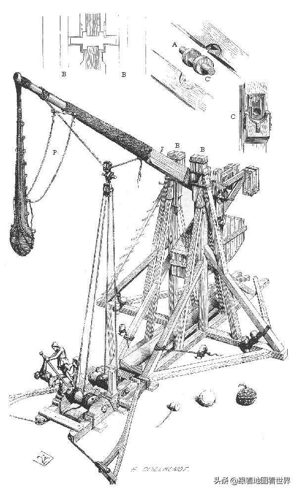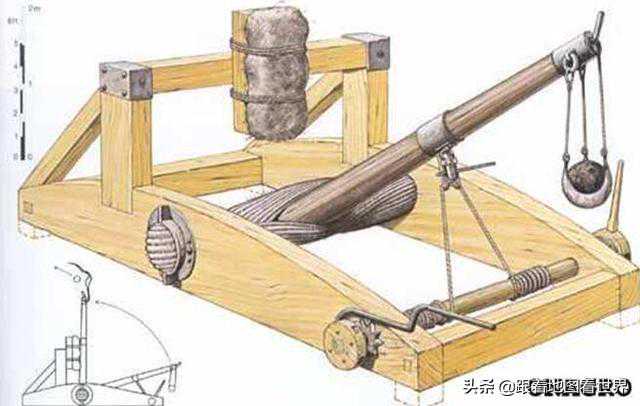 事实上,这种投石机与传统投石机所不同的在于其发力原理。原来欧洲的投石机以纤维或动物的筋拉扯所产生的反弹力挥出投石杆。