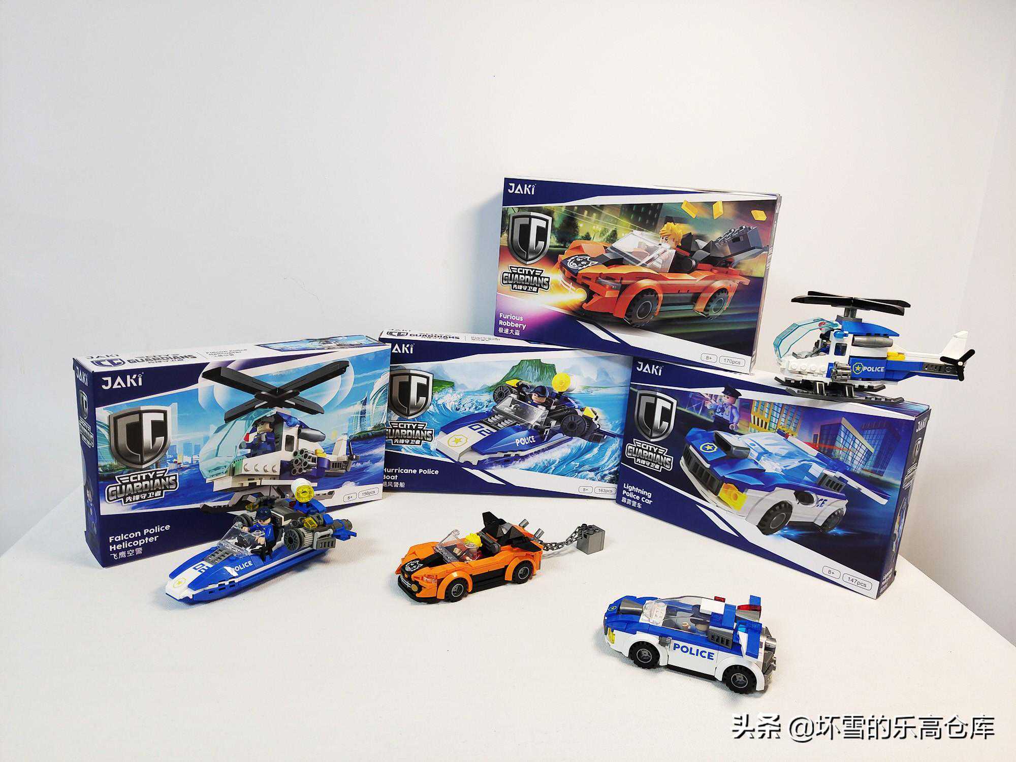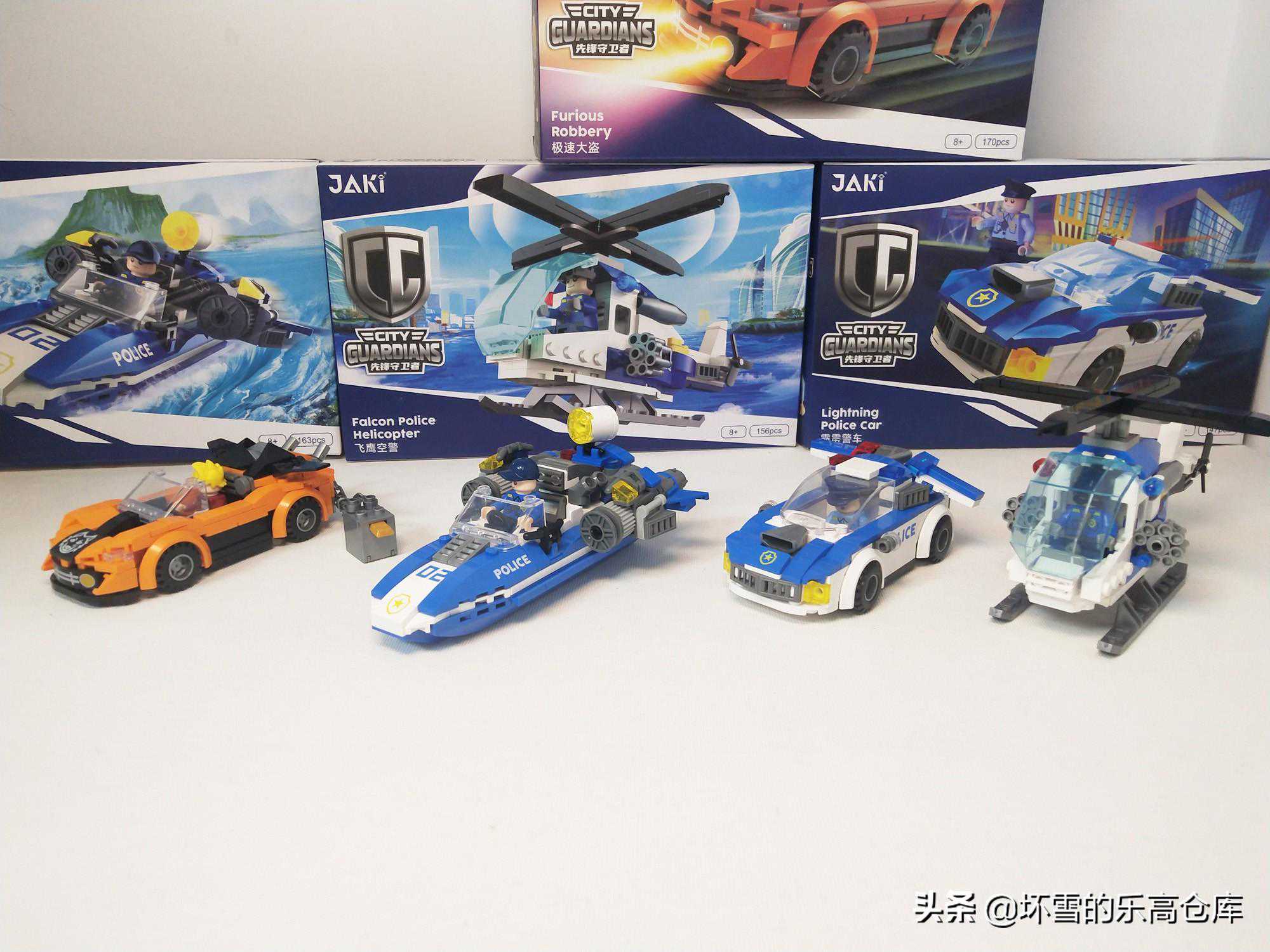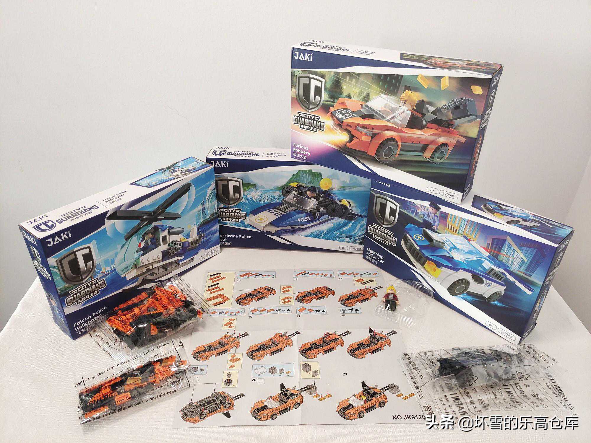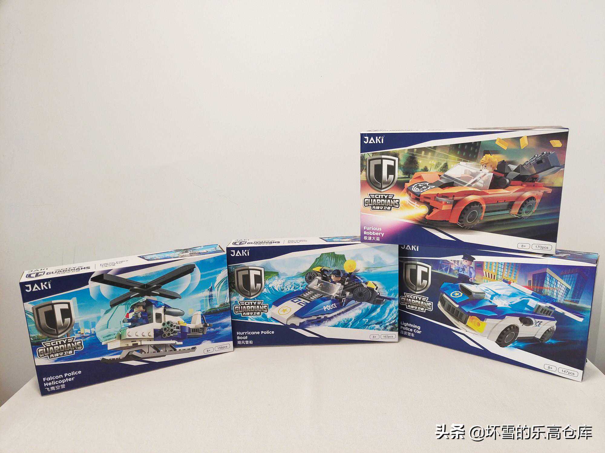 这四款载具外盒大小一样,印刷特色比较一致,主体为蓝色色调,也是大部分玩具品牌警察系列的通用颜色,作为反派的犯罪分子载具则是与之对立的红色色调。外盒尺寸均为长26.5厘米,宽16.5厘米,高5厘米,每个套装积木数量在140余块到170余块不等,单盒重量在200克上下,四盒共800余克。