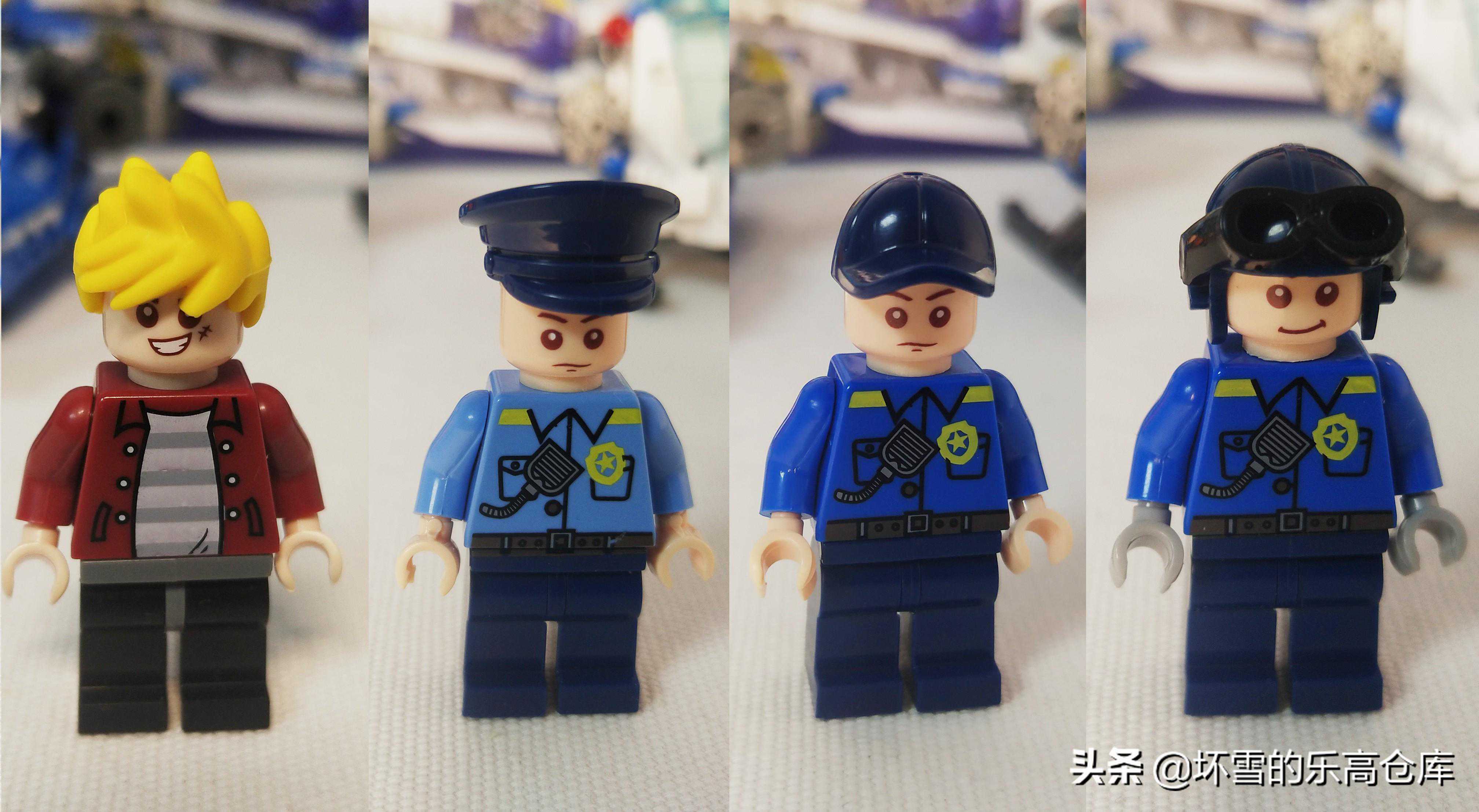 每个载具套装都附带一个人仔,人仔的造型还是不错的。大盗是一头金发,身穿暗红色夹克,一脸得意的歪嘴笑。三个警察人仔造型上大同小异,只用服装颜色和帽子进行区分,其中空警戴着手套,并且额外配备一个护目镜。可惜的是人仔都是单面脸印刷,特别是大盗只有一张笑脸,应该给他再配个被抓住时的哭丧脸就好了。