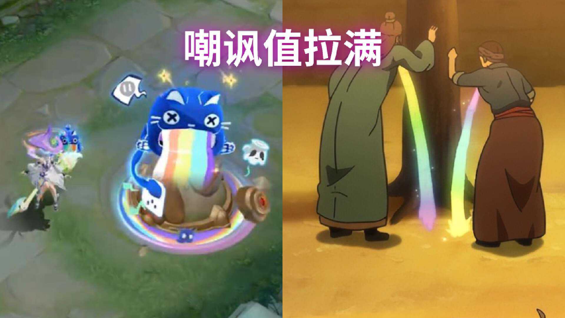 而且除了皮肤特效之外,这款皮肤的一些彩蛋也十分有趣,比如属于无双皮肤专属的推塔特效。使用这款皮肤推掉敌方防御塔之后,在防御塔的废墟上会出现一只蓝色的猫状生物,嘴里还不停的呕吐彩虹,对于使用者来说,这是一个非常有趣的彩蛋,但是对于小乔的敌人来说,这个特效就非常具有嘲讽意义了。