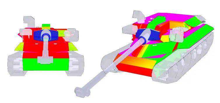 相较之下,MBT-B的车体防护破绽较多。车体首上对AP和HEAT的等效分别为305~320/340~360毫米左右,但首下的厚度由最初的165削减至145毫米,等效也相应由220降低到190毫米,如此一来对VIII~IX级坦克的压制力将明显降低。此外,履带上方的车体的“肩膀”部分在正对情况下等效仅有245毫米左右,难以抵挡同级坦克的射击,这一缺陷也导致MBT-B并不太适合卖侧玩法。不过,数据调整也并非全是削弱,比如说驾驶员舱和车体衔接处的一小片水平区域在加强至45毫米后,就消除了顶牛时车体上的潜在弱点。