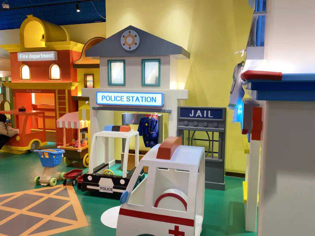 整个场馆有一千平左右,分为不同主题的几大区域。首先是正面就能看见的换装区域——探索岛,里面有小朋友喜欢的面包房、烹饪房、化妆间、花店、超市等等。还有消防站、警察所、医院等等,里面都有警察、消防员、医生的和小衣服、帽子工具等等,小朋友们可以装扮成喜欢的样子,畅快玩耍变装游戏。