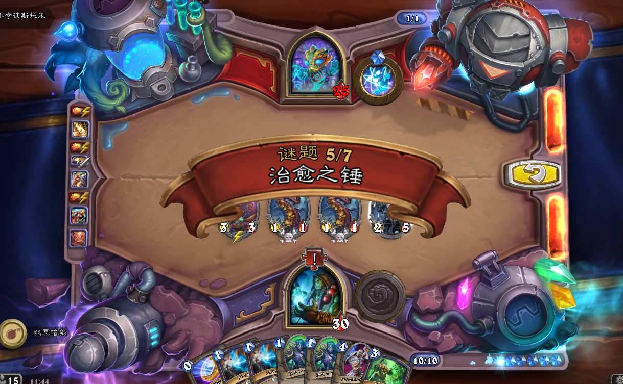 第六关,烤蛇宴,这关要点一开始火火怎么算都算不死对面,后来发现原来这条蛇可以-1血的。丢丢两只炎术士,然后命令怒吼,然后21武器走脸,旋风斩,软泥,硬币,游戏结束。