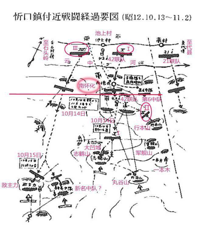 上图示意13日第42联队三个大队的战斗情况。第3大队第10中队早上就占领了新练家庄【现名新村,忻口西北8公里],第3大队渡过北云中河,进攻旧练家庄【忻口西6公里,南怀化西2公里】和秦家庄【忻口西7公里】,并向秦家庄[忻口西7公里]南方进攻。第1大队13日渡过北云中河,攻占了南怀化,并向南怀化南方前进。第2大队则在第1大队后方前进,13日晚上在旧练家庄【忻口西6公里,南怀化西2公里】驻守。图上的箭头表示日军的进攻方向。