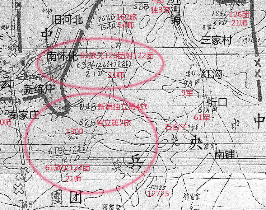 上图是中方绘制的“中央军中央兵团在南怀化附近战斗要过要图(10月13日夜至15日夜)”的局部放大。从图上看,守卫在南怀化附近的中方军队是第21师【师长李仙洲】第63旅【旅长吕祥云】率第124团【团长李尚镜(河北咸县人,随营学校)一说是团长庄村夫】、第125团【团长张子耕】、欠第126团【团长王元堂】,附第122团【团长刘芳贵】。