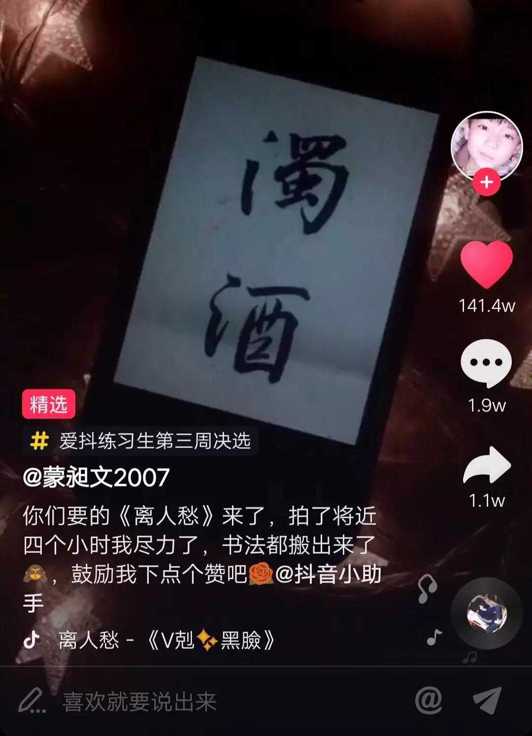 “你们要的《离人愁》来了,拍了将近四个小时我尽力了,书法都搬出来,鼓励我点下赞。”