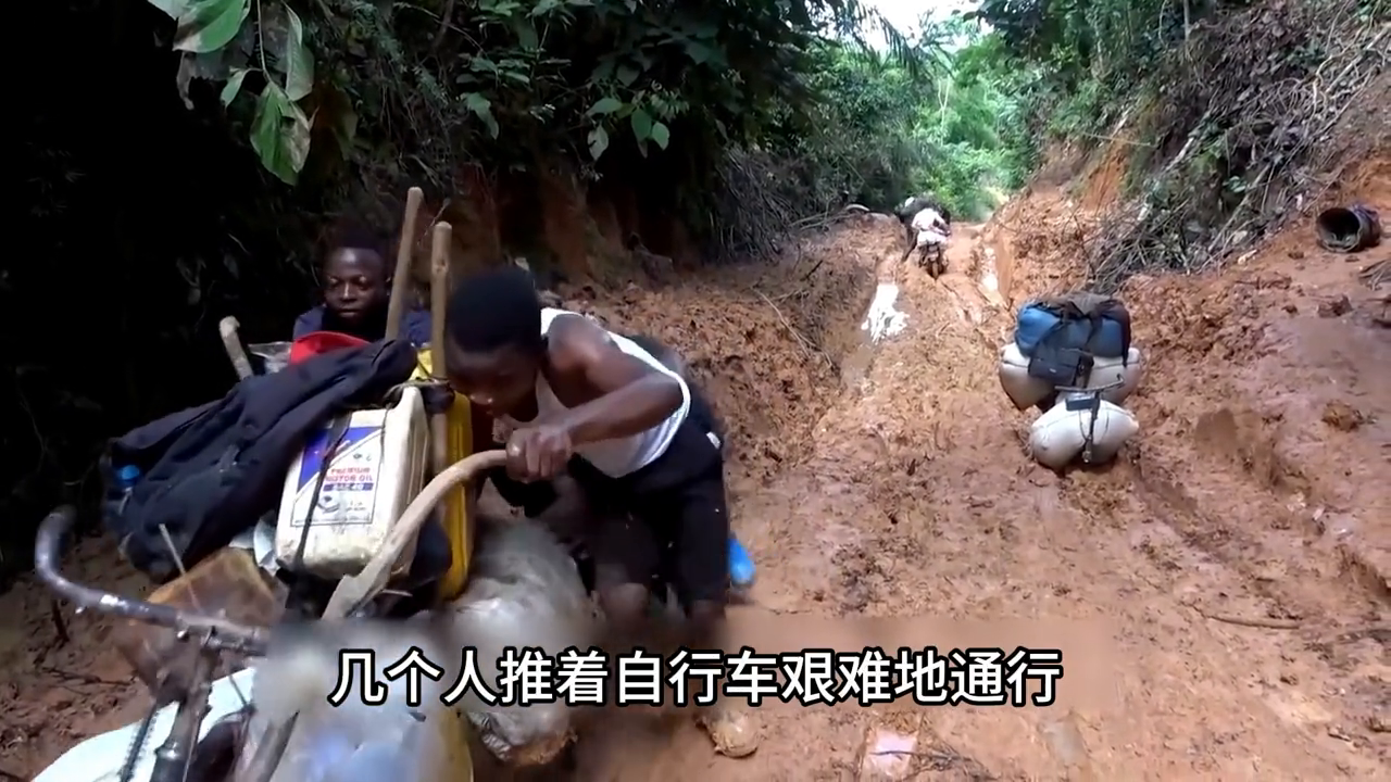 不多时就到了最有挑战力的路段,看到前面的路况强如奥德彪,也不得不停下车来观察。只见黑哥们强拉硬拽,几个人推着自行车艰难地通行,一个不小心就要连人带车跌倒。在这个泥泞的道路上,奥德彪没办法只能咬着牙强行通过,不想被困在这里。