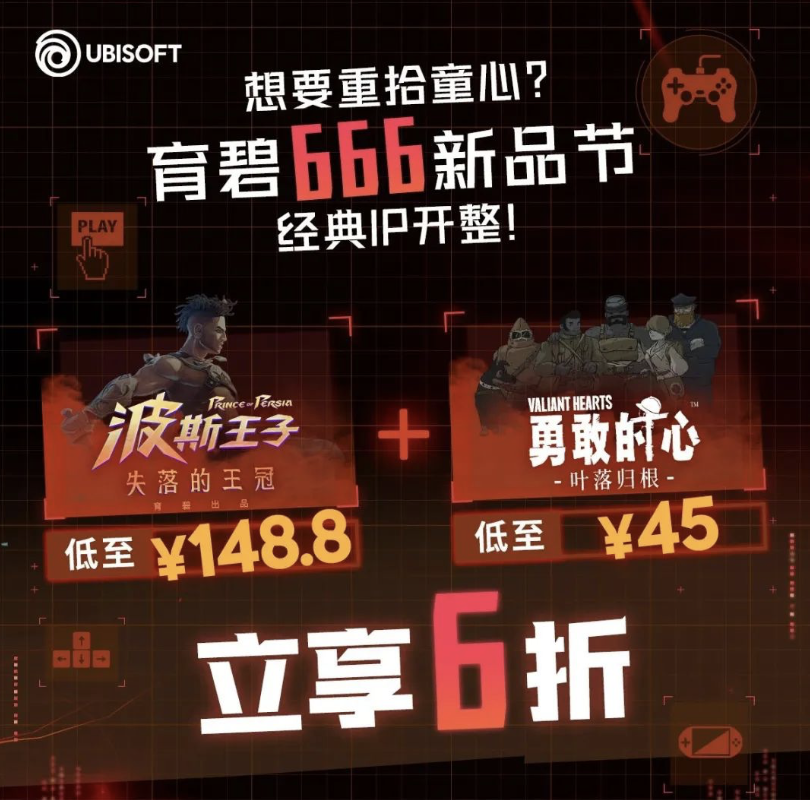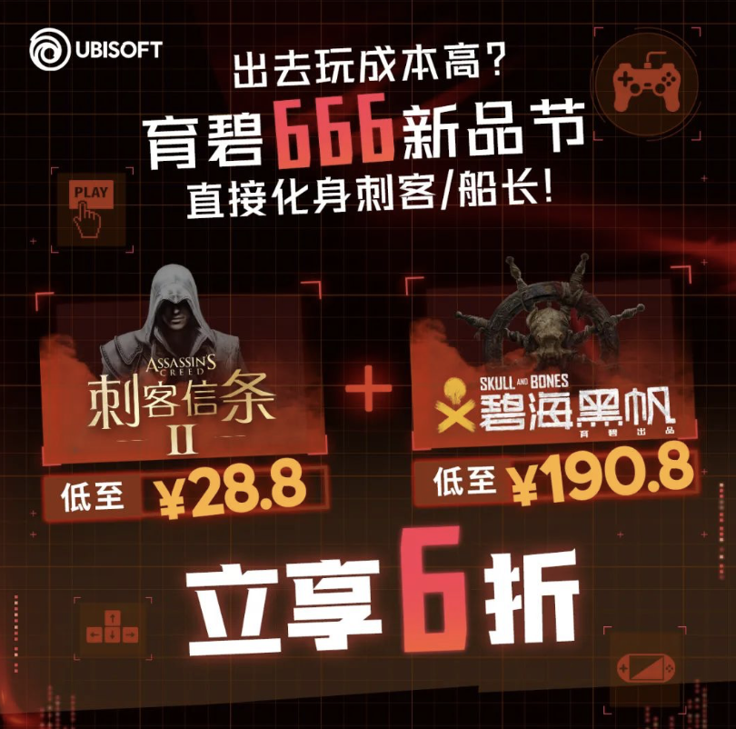 IT之家3月8日消息,据“UBISOFT育碧”官方公众号,育碧商城即日起开启“666新品节”活动,号称“任意两款游戏加入购物车后立享6折”。