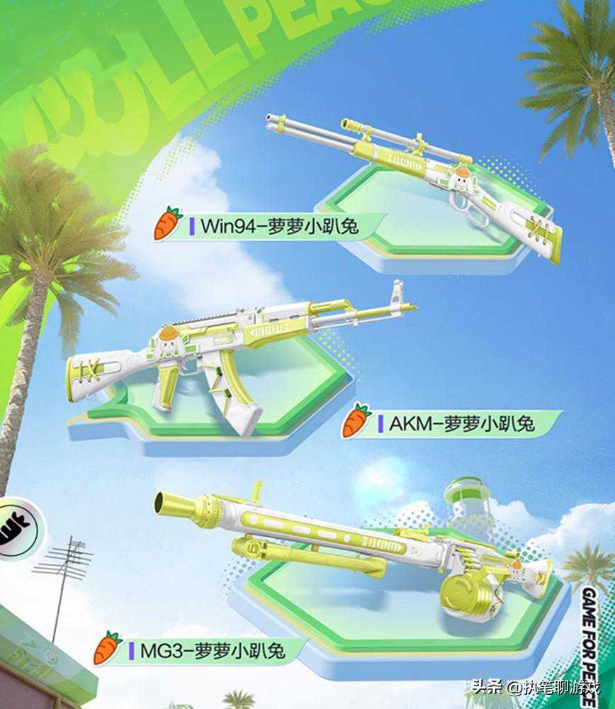 首先是3个枪皮,它们分别是Win94、AKM、MG3,颜色搭配方面以白色、绿色为主,看起来就一种“清凉”的感觉。