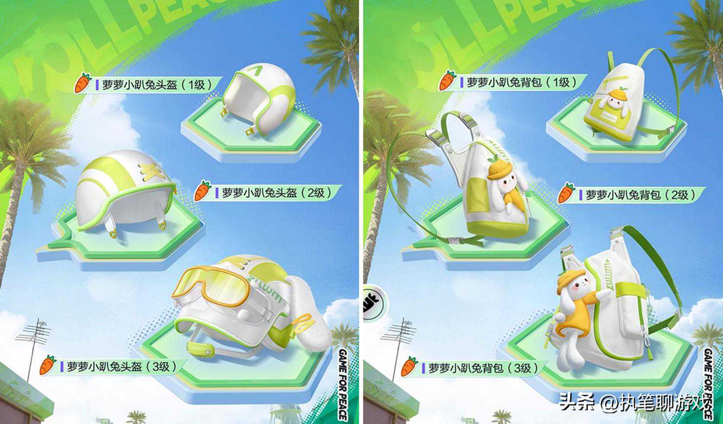然后出场的是头盔与背包,其中的1级头、2级算是中规中矩,个人觉得谈不上丑,但又说不上好看,但是3级头还是挺可爱的,特别是长长的兔耳朵、大大的护目镜,这种装扮应该会比较讨女玩家的喜欢。