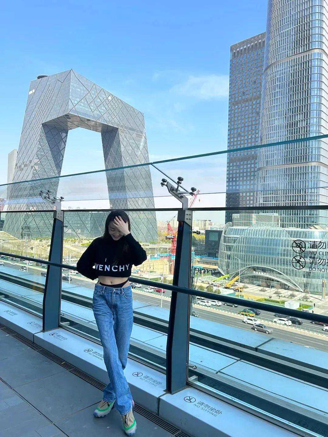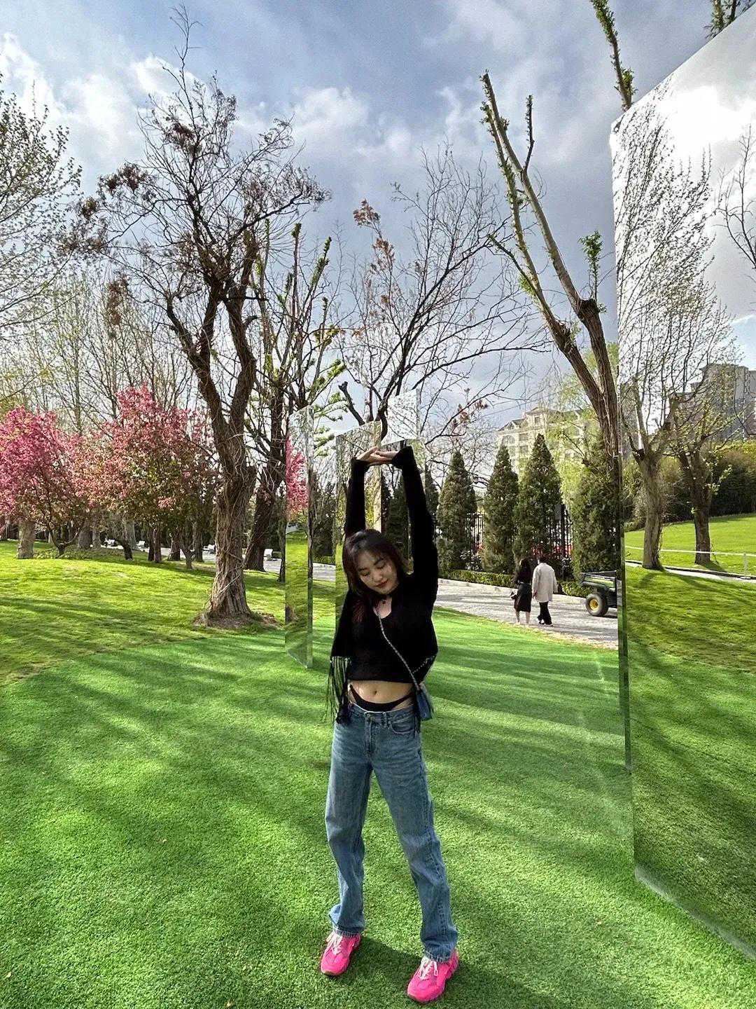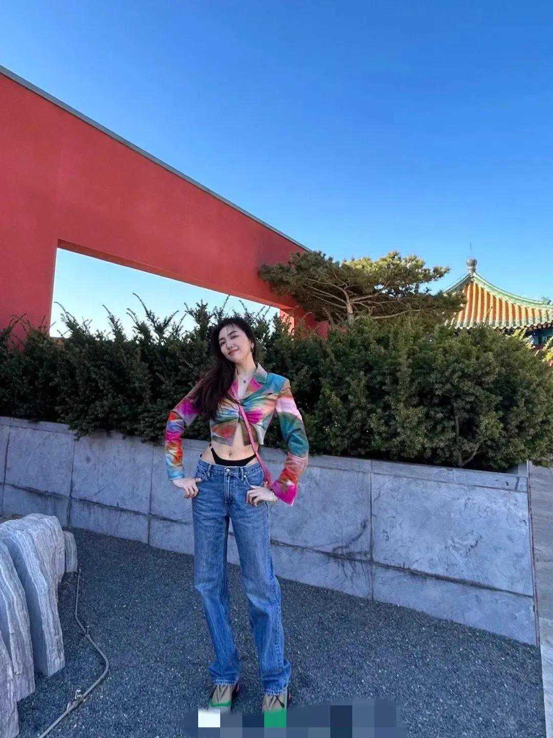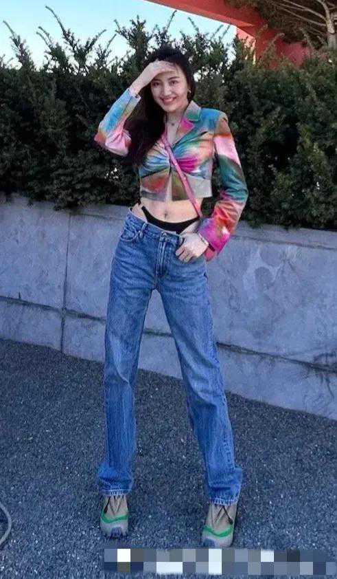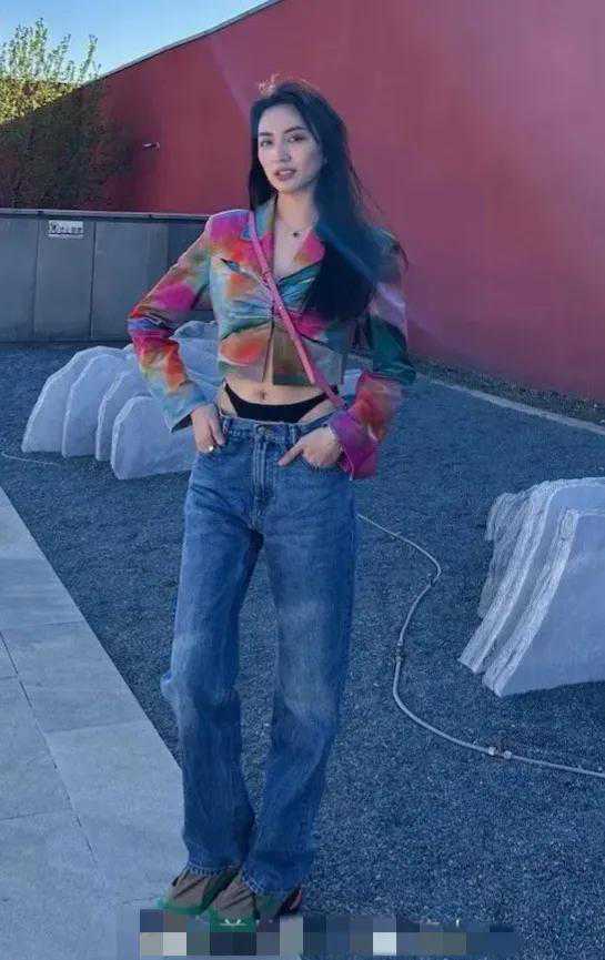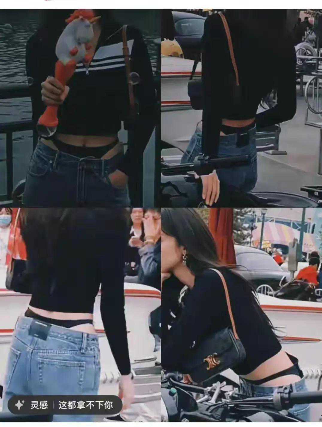 值得一提的是她把裤子穿出的尺度和古力娜扎不相上下,都是里面的黑色让它使劲往上提,而外面的牛仔就让它使劲往下拽,以此来让它露出来更多。